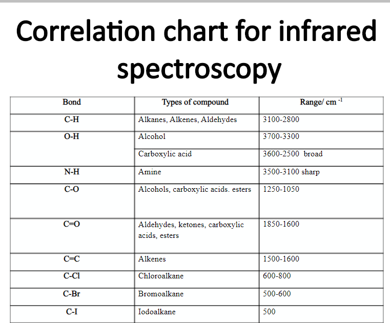 An infrared spectroscopy correlation table or table of infrared absorption frequencies is a list of absorption peaks and frequencies typically reported in wavenumber for common types of molecular bonds and functional groups. There is an inverse correlation of the C O stretching frequency with the dielectric constant ε. Correlation with known compounds of undisputed configuration.