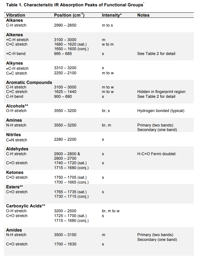 The aims of the study were to suggest the possibility of identifying aphids through the use of Fourier-transform infrared FTIR spectroscopy and to. Une table de correspondance en spectroscopie infrarouge est la liste des pics dabsorption ou bandes puis quon les présente dans des diagrammes de transmission généralement en termes de nombres donde pour les types liaisons moléculaires et groupes fonctionnels communs 1 2En chimie physique et en chimie analytique la spectroscopie infrarouge. C 1700 cm-1 and 2510-3000.